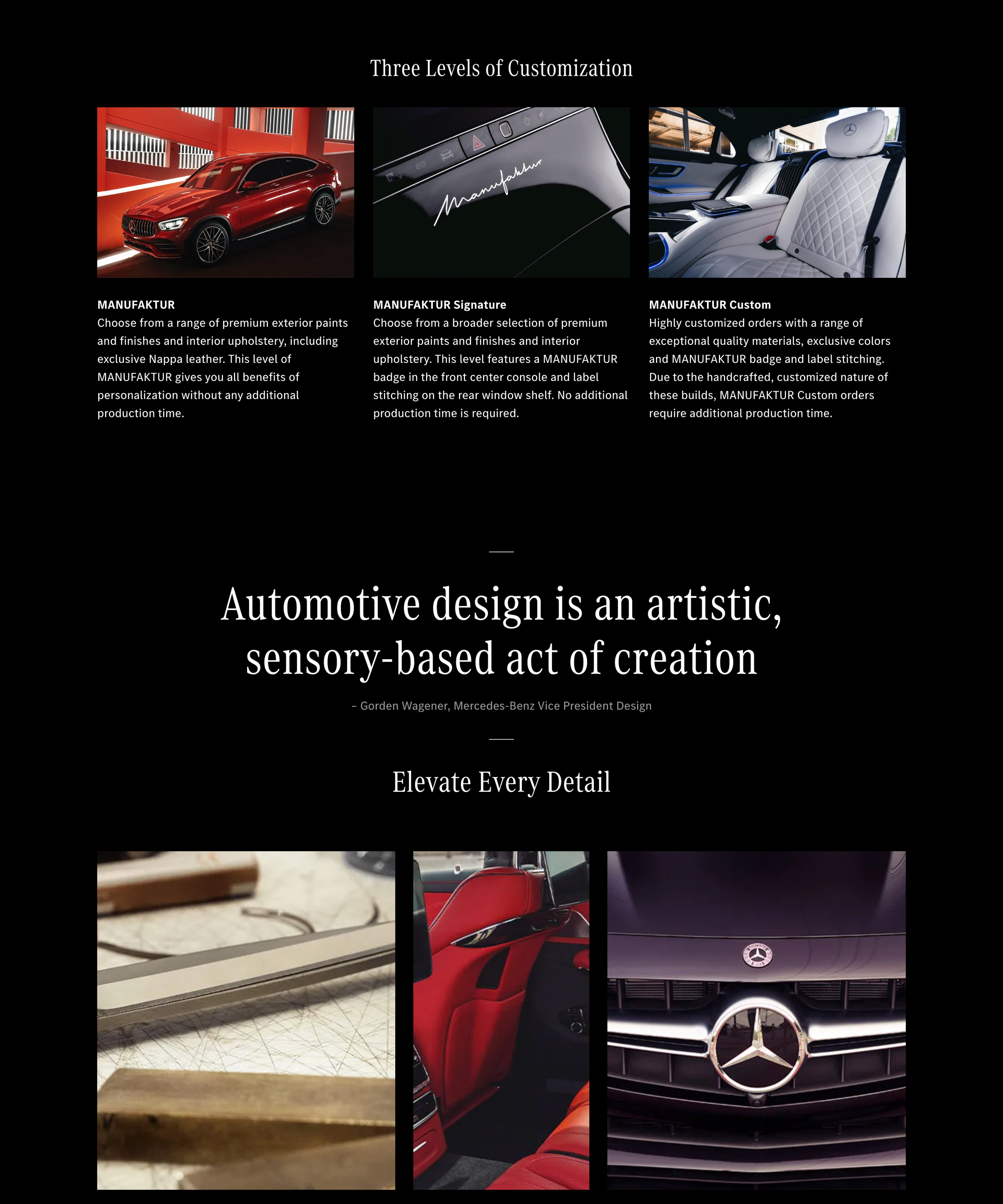 Manufaktur is a bespoke customization service offered by Mercedes-Benz, allowing customers to personalize their vehicles with a variety of exclusive appointments and options. The program focuses on craftsmanship and individuality, offering premium materials, special colors, and unique interior and exterior finishes unavailable in the standard lineup.